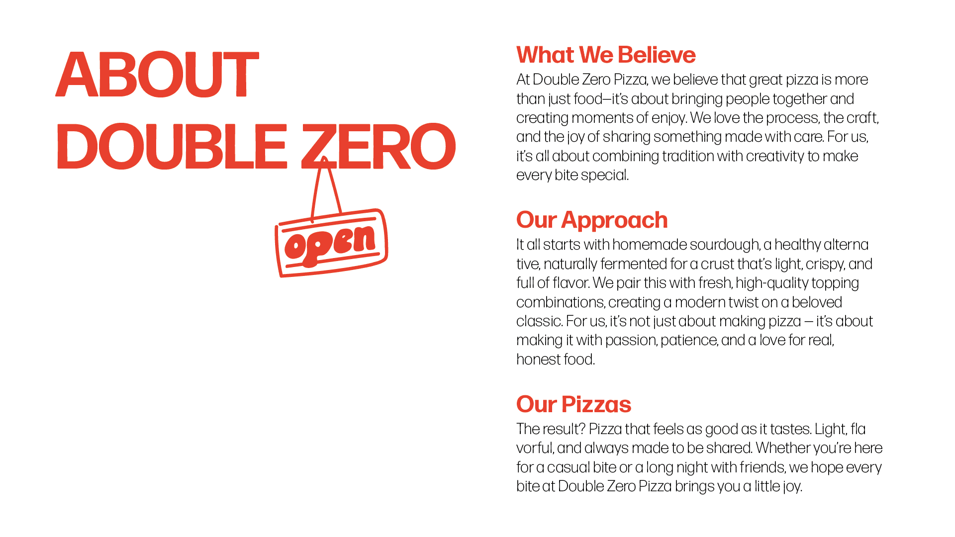 Pizza ist mehr als nur ein Gericht – Pizza bringt Menschen zusammen. Auf diesem Gedanken basiert das Markenkonzept von Double Zero Pizza: eine moderne Pizzeria im Herzen von Köln-Ehrenfeld, die italienische Handwerkskunst mit amerikanischer Experimentierfreude verbindet. Statt klassischer Pizzeria setzt Double Zero auf selbst fermentierten Sauerteig, unkonventionelle Toppings und eine urbane, internationale Ausstrahlung. Ziel des Projektes war es, auf Basis eines bestehenden Logos eigenständige, wiedererkennbare Marke zu formen, die sich durch klare Gestaltung und ihre visuelle Sprache auszeichnet und Lust auf mehr macht.