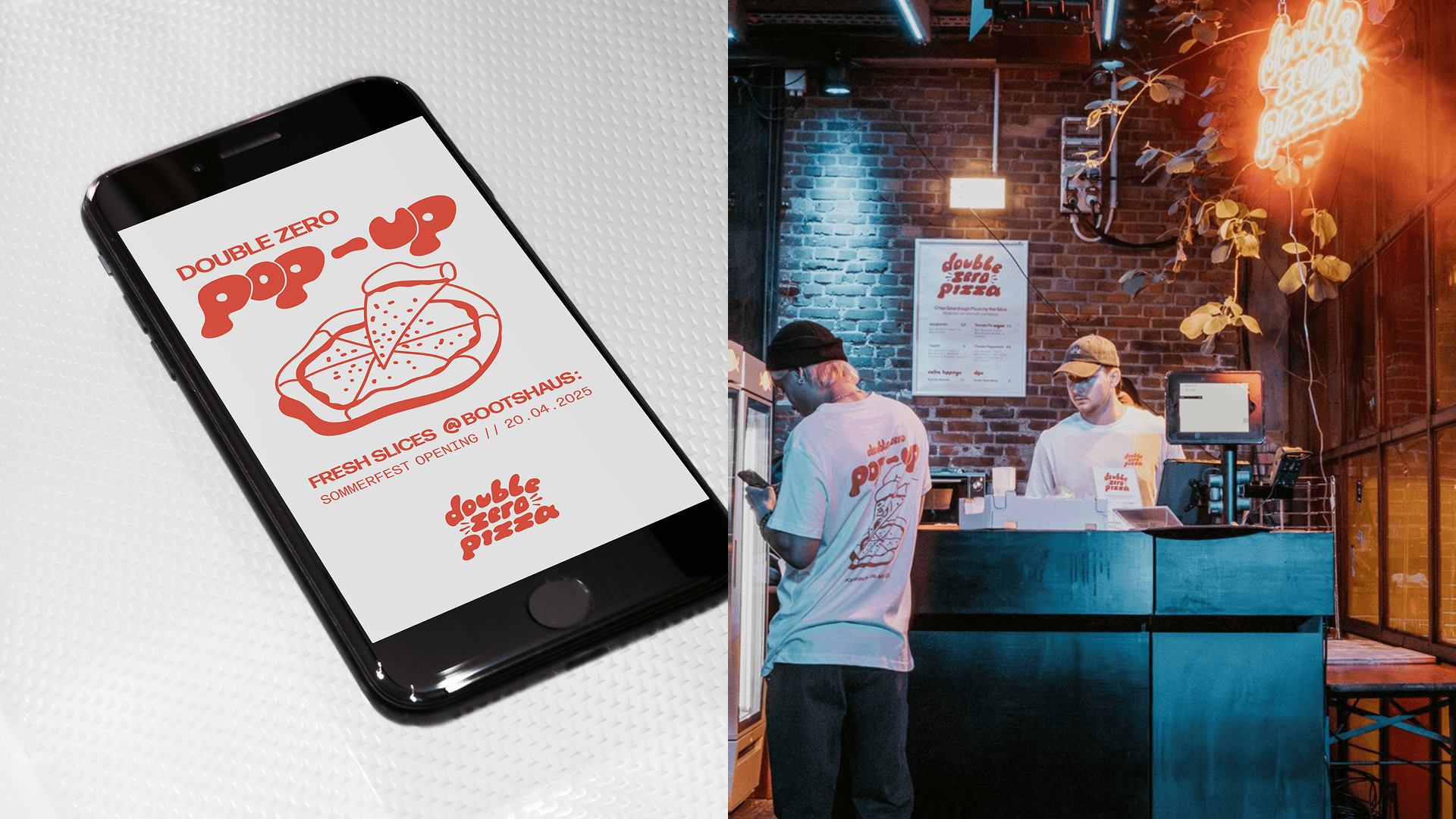 Double Zero Pizza wurde 2024 in Köln-Ehrenfeld eröffnet – mit der Vision, einen neuen, urbanen und alternativen Ansatz von Pizzerien zu verkörpern. Die Grundlage der Zusammenarbeit bestand aus einem bereits existierendem Logo und ersten Gestaltungsideen, welche in eine vollständige Markenwelt übersetzt werden sollten.